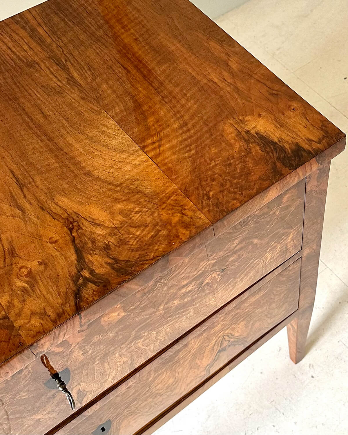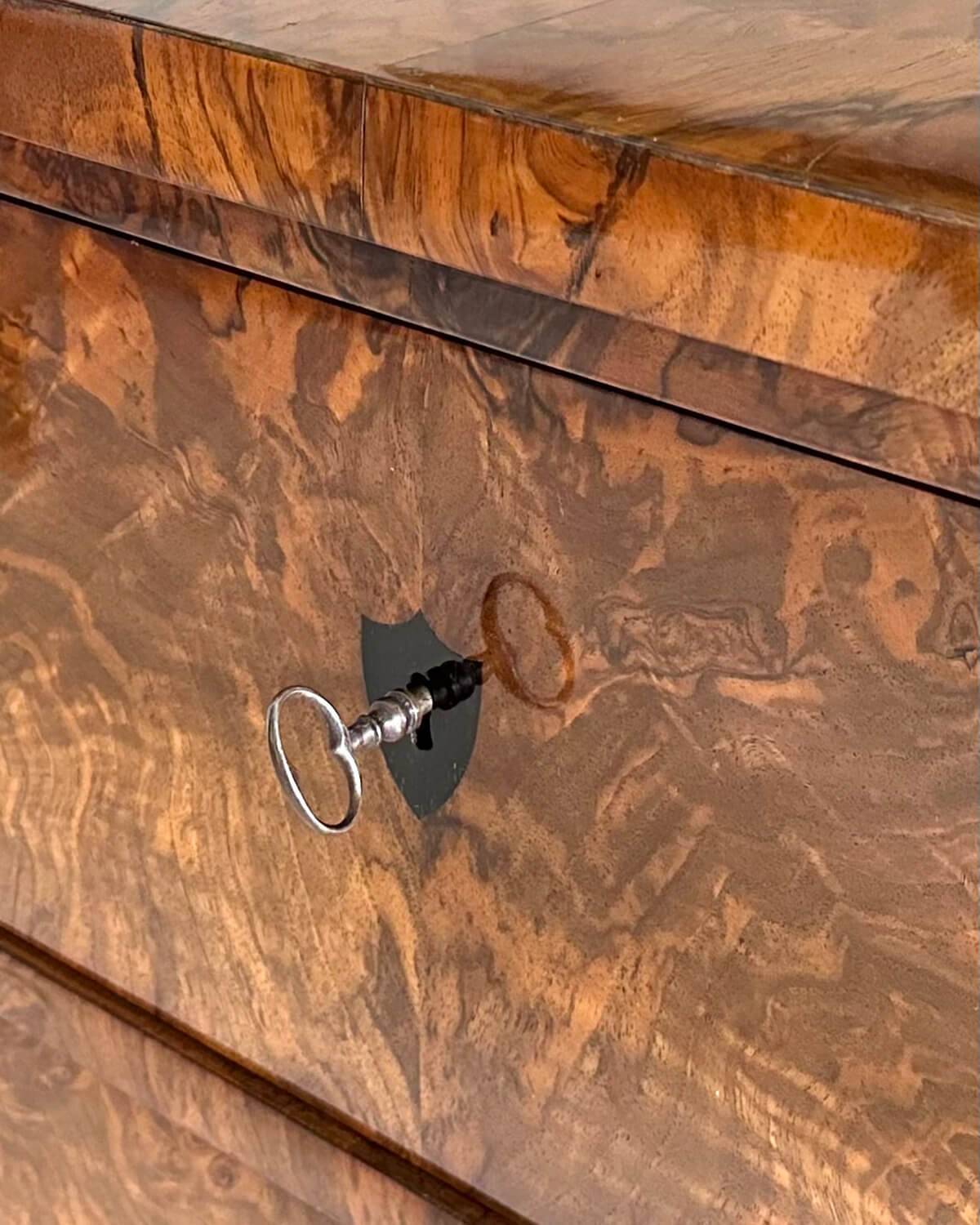 Cómoda alemana de principios del estilo Biedermeier, chapada en nogal con bocallaves de ébano y cerraduras originales. Hacia 1815. A: 80 cm, L: 86 cm, P: 47 cm.
