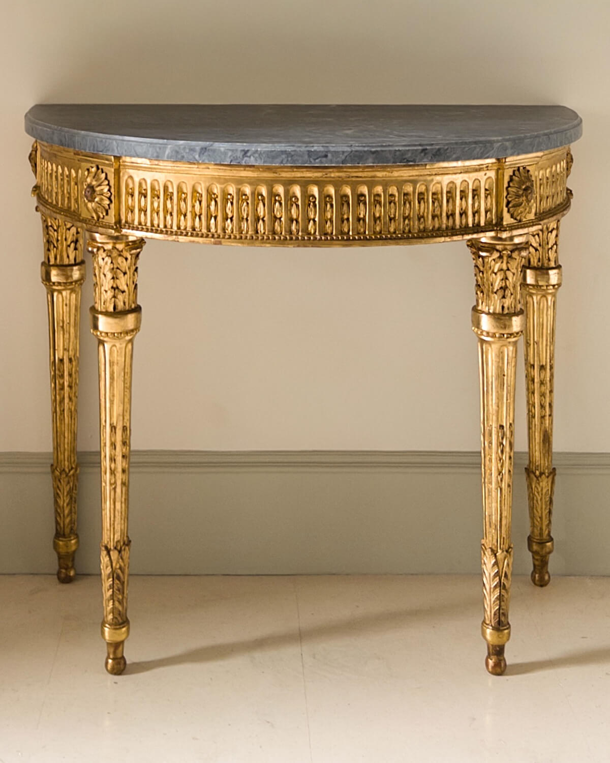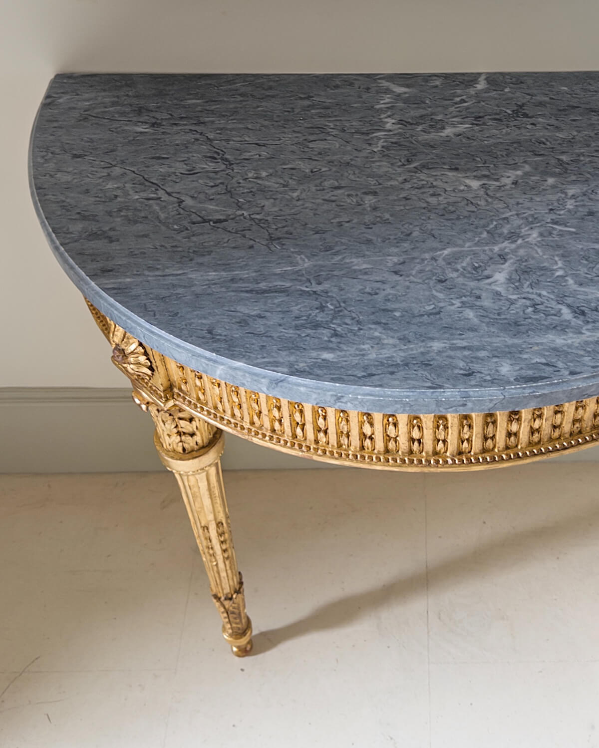 Consola Luis XVI en madera ricamente tallada y dorada, en forma de media luna, con cuerpo y patas decoradas con acanaladuras y espárragos, grandes flores doradas en los dados de conexión y capiteles formados por hojas de acanto. Tapa de mármol Bleu Turquin. Francia, alrededor de 1780. Altura: 86,5 cm, ancho: 99 cm, profundidad: 54 cm