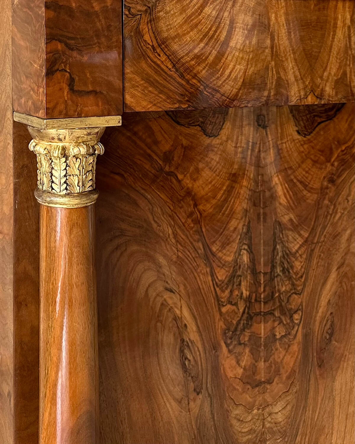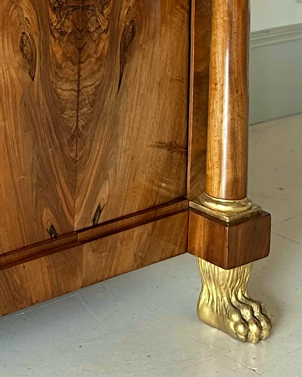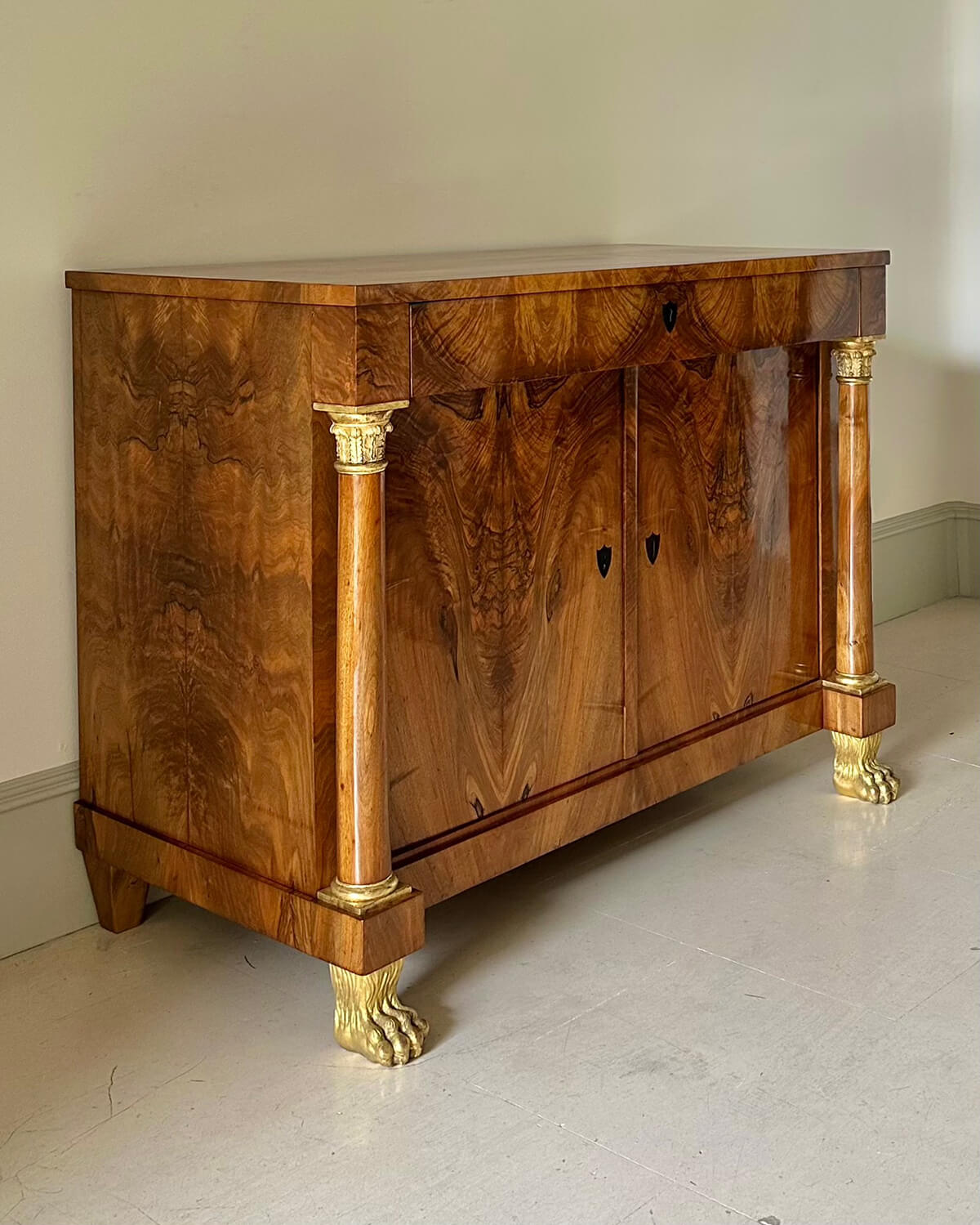 South German Biedermeier side cabinet, walnut veneered, columns and lion feet in gilded wood. Keyholes in ebony. Franconia, Bavaria, around 1820. H: 87 cm, W: 108 cm and D: 57 cm.