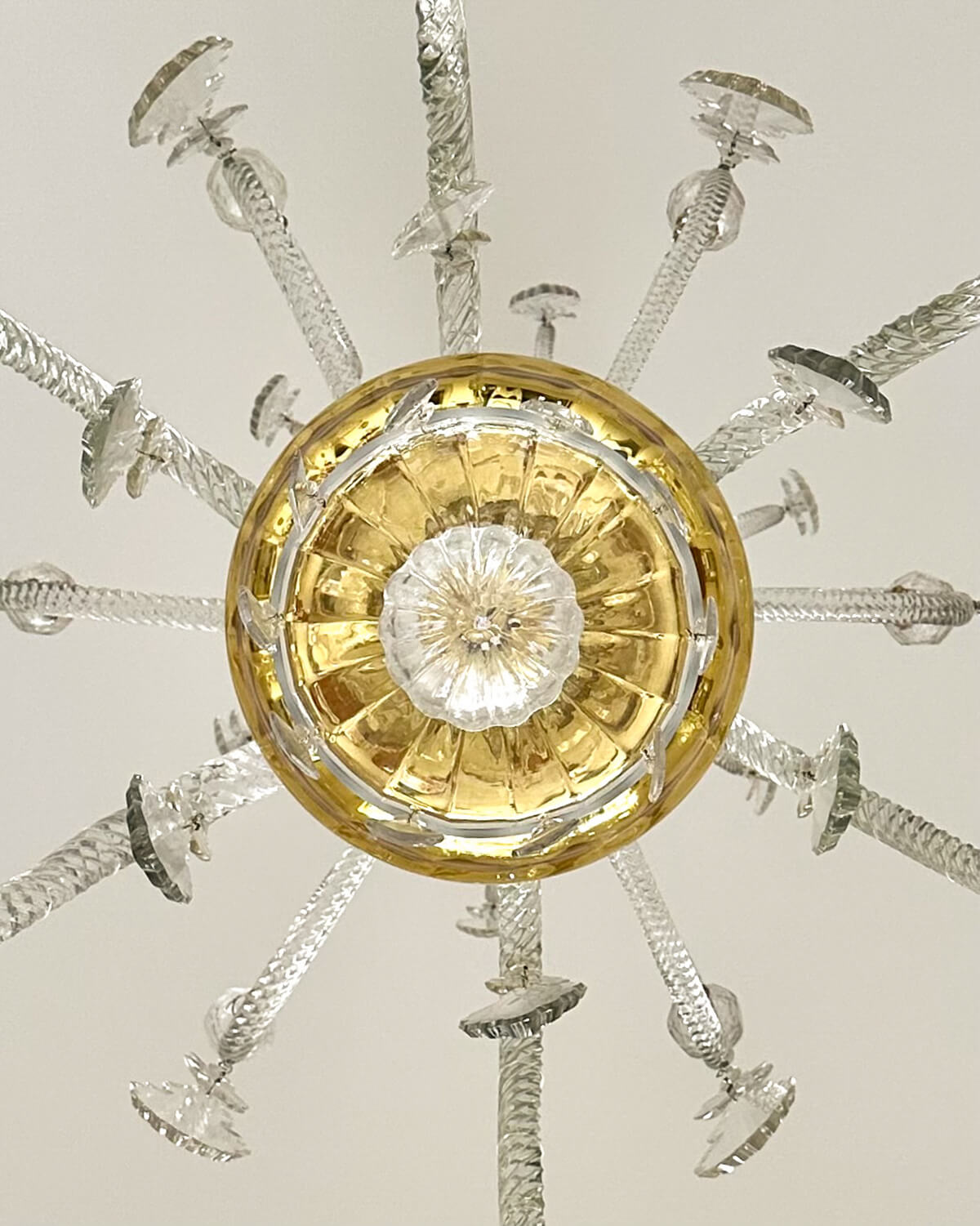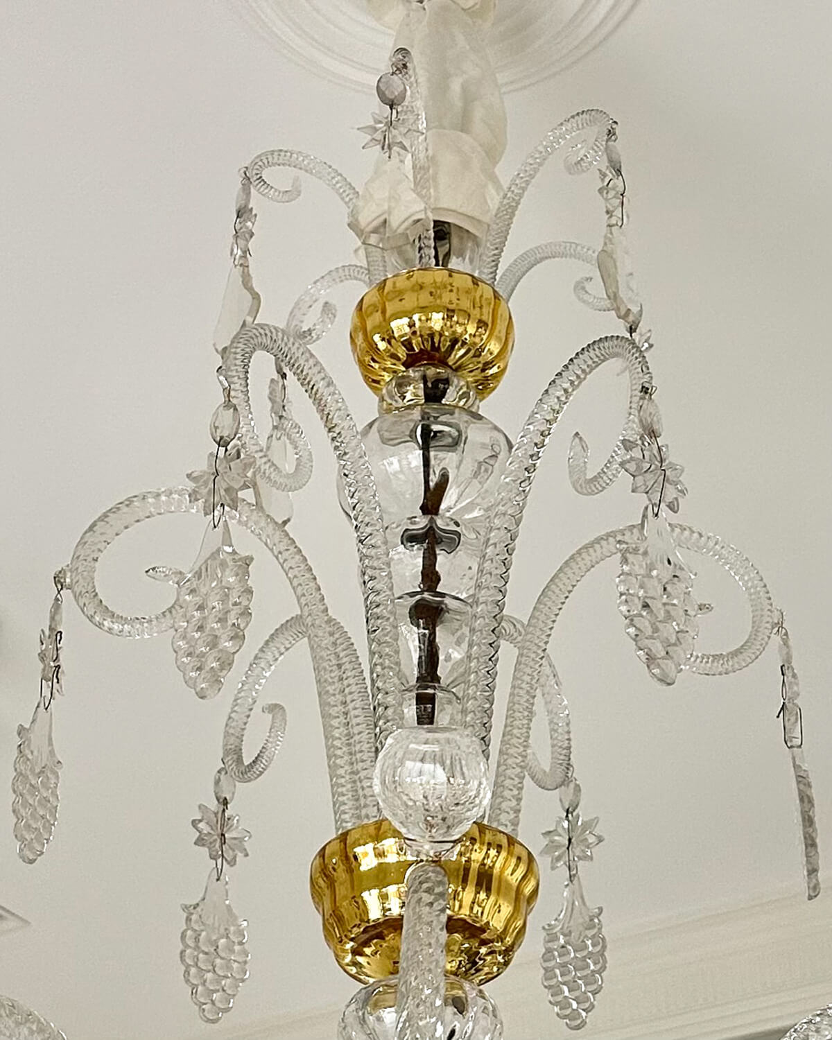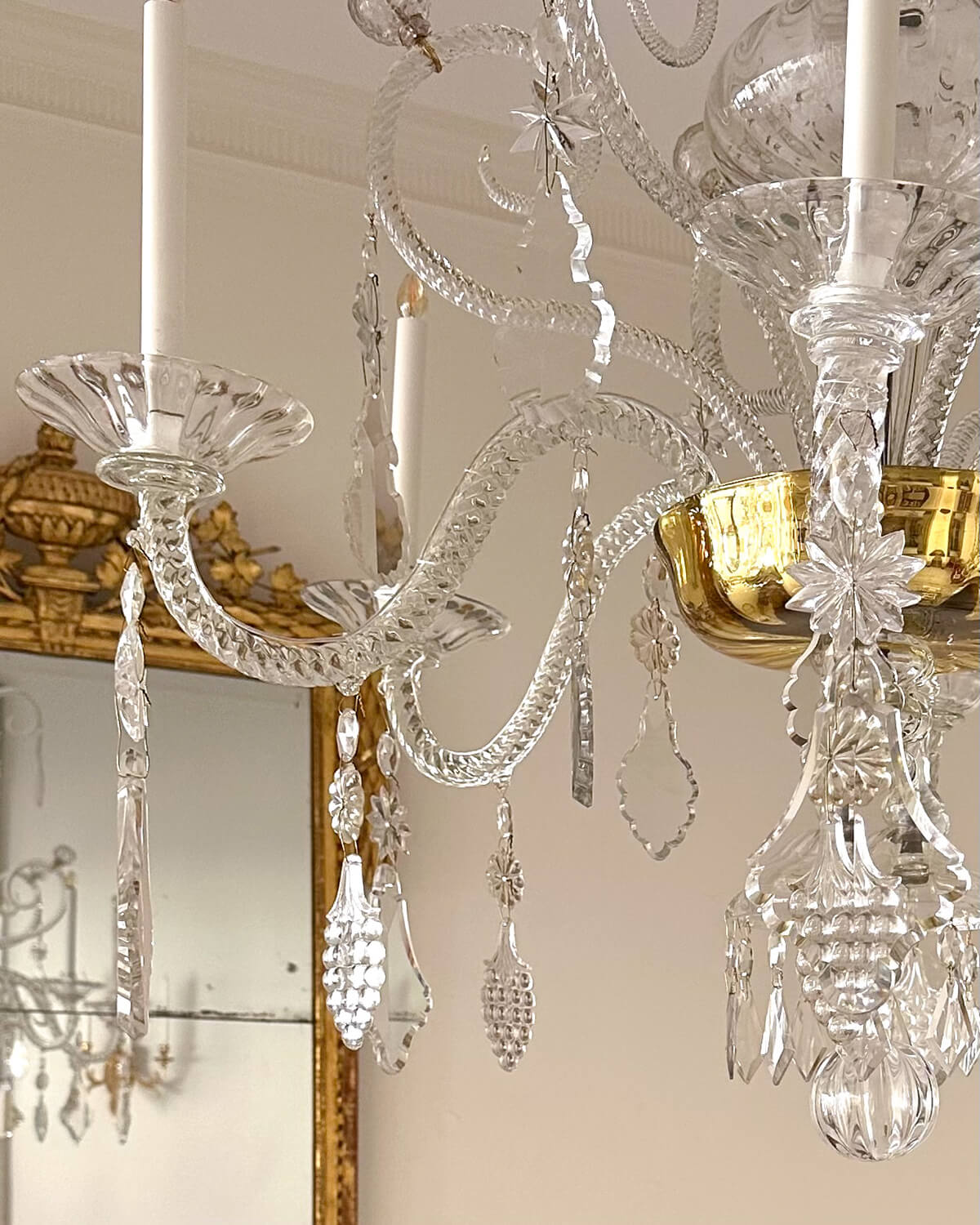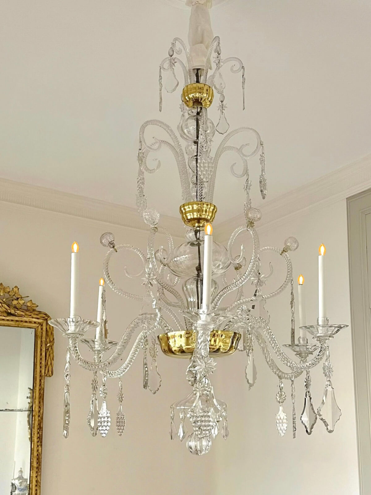 Large 18th century six-arm chandelier, blown, gilded and cut glass, from the Royal Glass Manufacture of La Granja. La Granja de San Ildefonso, Spain, around 1780. Height: 135 cm, diameter: 100 cm.