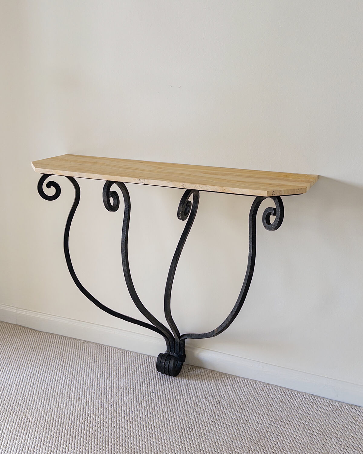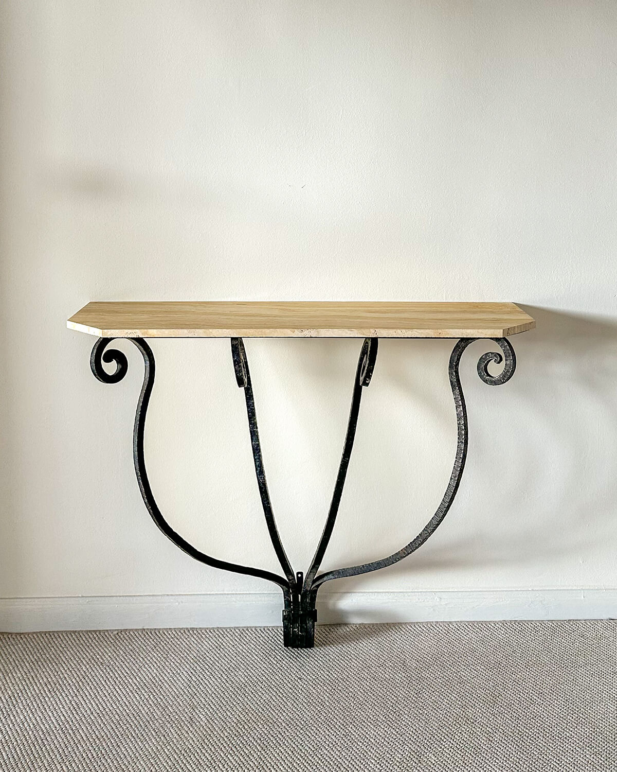 Consola francesa Art Déco de hierro forjado, con tablero de mármol Travertino Romano. Hacia 1940. Altura: 95 cm, ancho: 119 cm, profundidad: 36 cm.