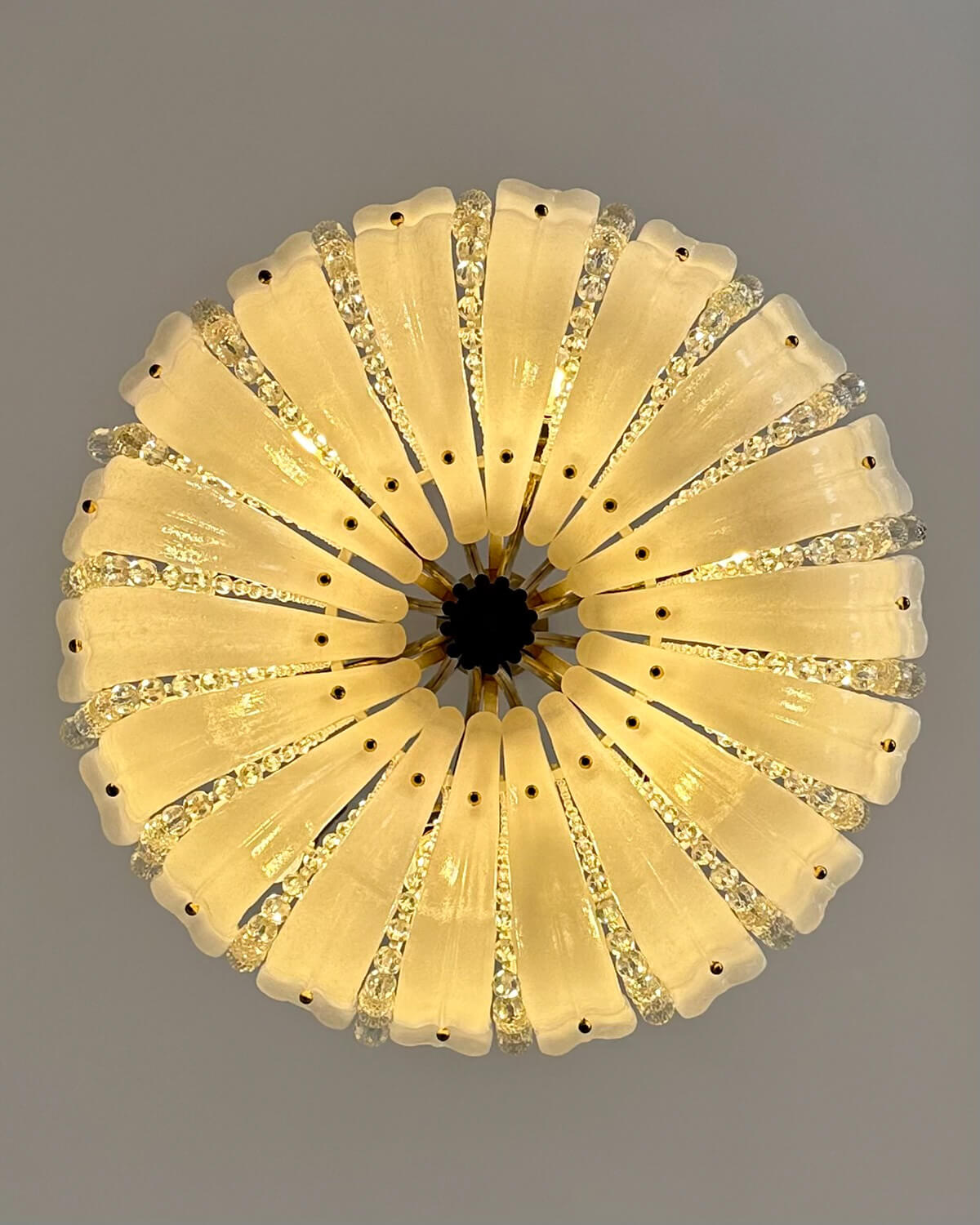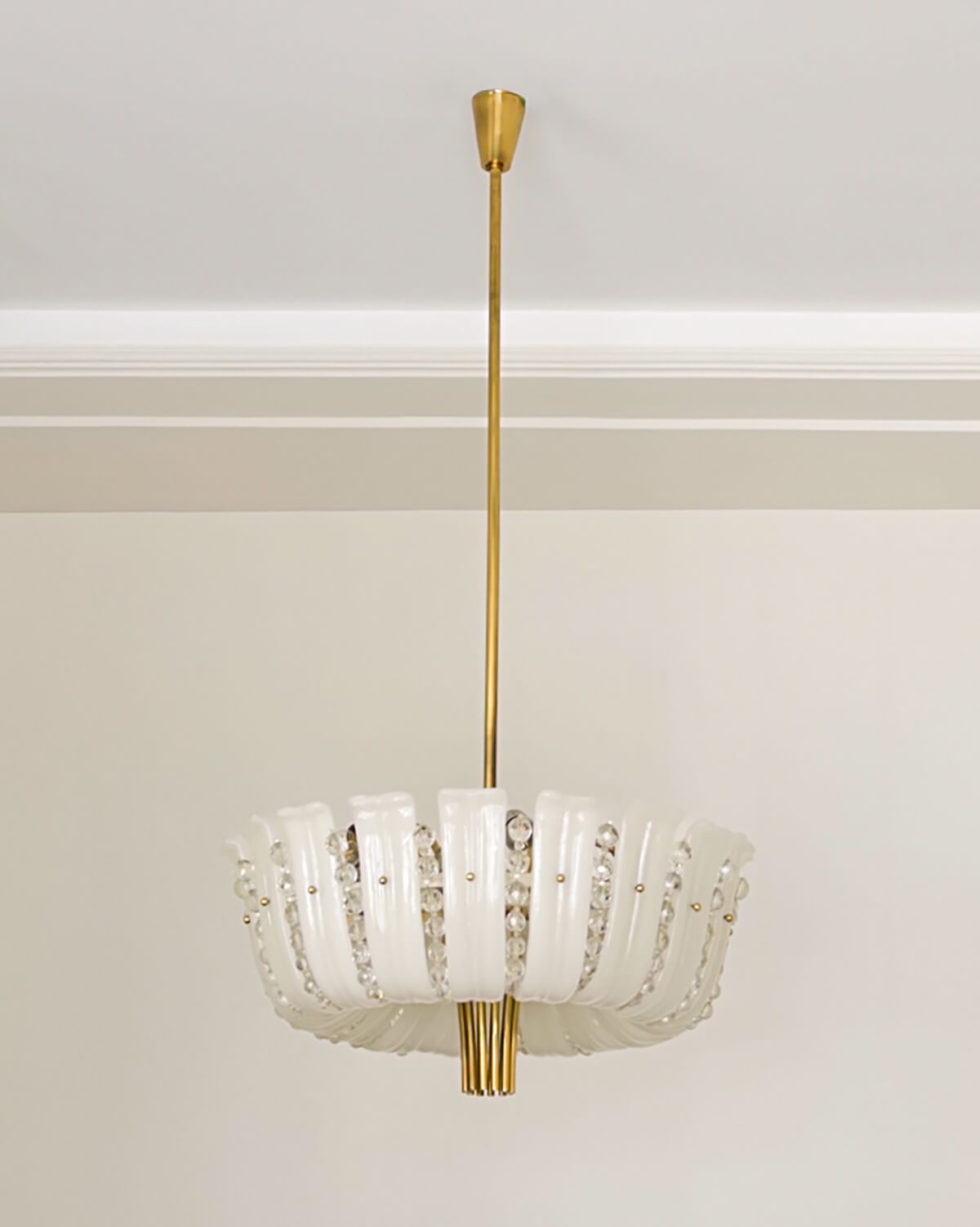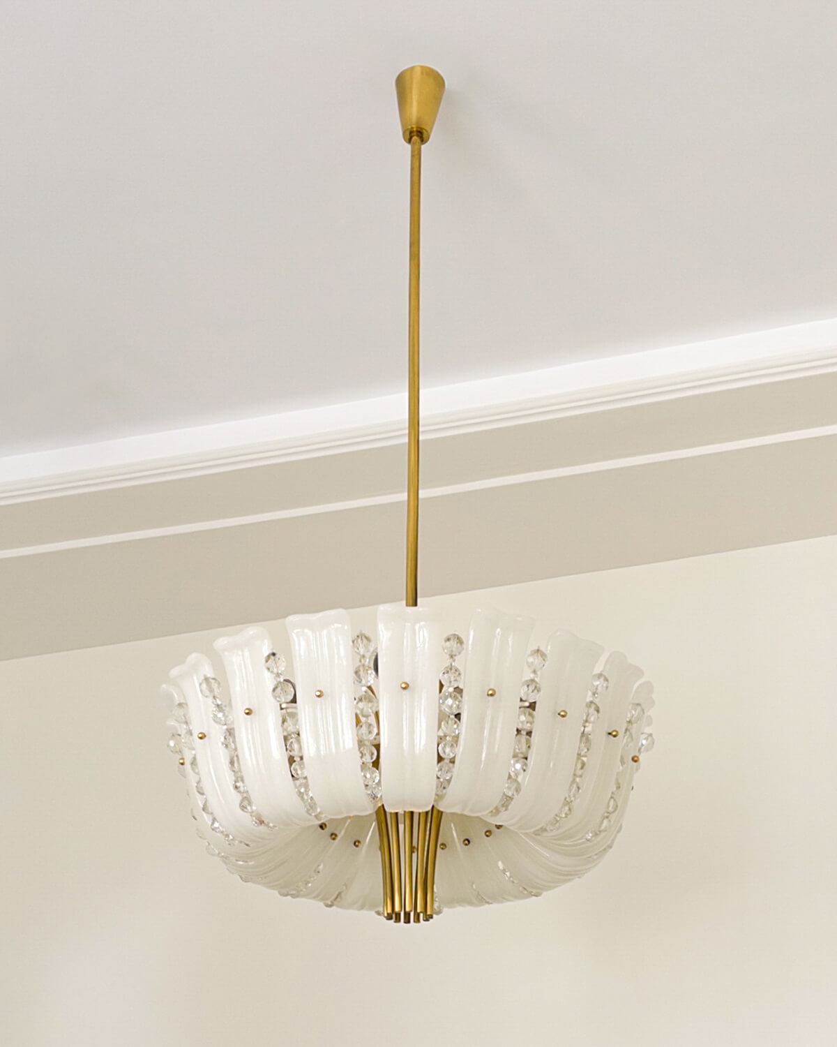 Lámpara de techo Tardano diseñada por J. T. Kalmar. Estructura escultórica de latón y metal lacado en blanco, lámpara de araña en forma de cesta compuesta por vidrio espumado blanco y cadenas de vidrio tallado, con capacidad para doce luces. Viena, finales de la década de 1950. Lámpara: altura 30 cm, diámetro 67 cm. Longitud total colgante: 135 cm.