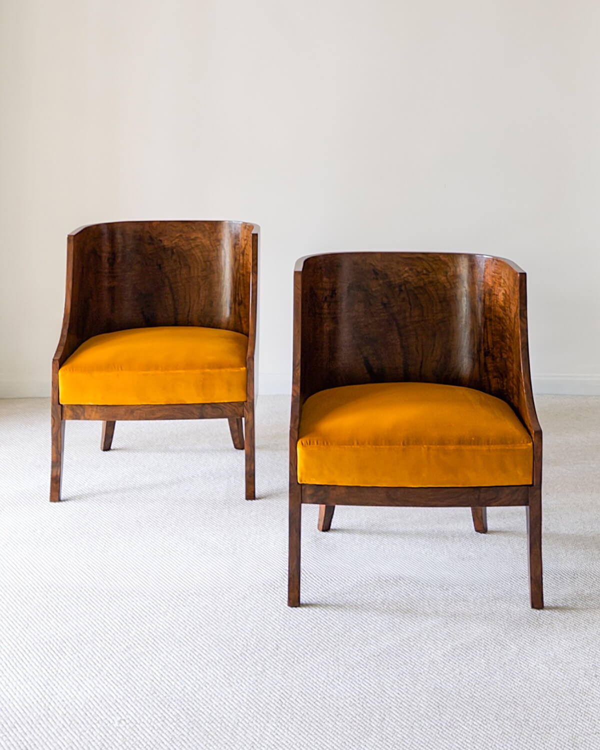Par de sillones neoclásicos Art Déco tipo barril, chapados en nogal oscuro. Recientemente tapizados en terciopelo fino por nuestro taller. Italia, alrededor de 1930. Altura: 86 cm, anchura: 67 cm, profundidad: 65 cm.