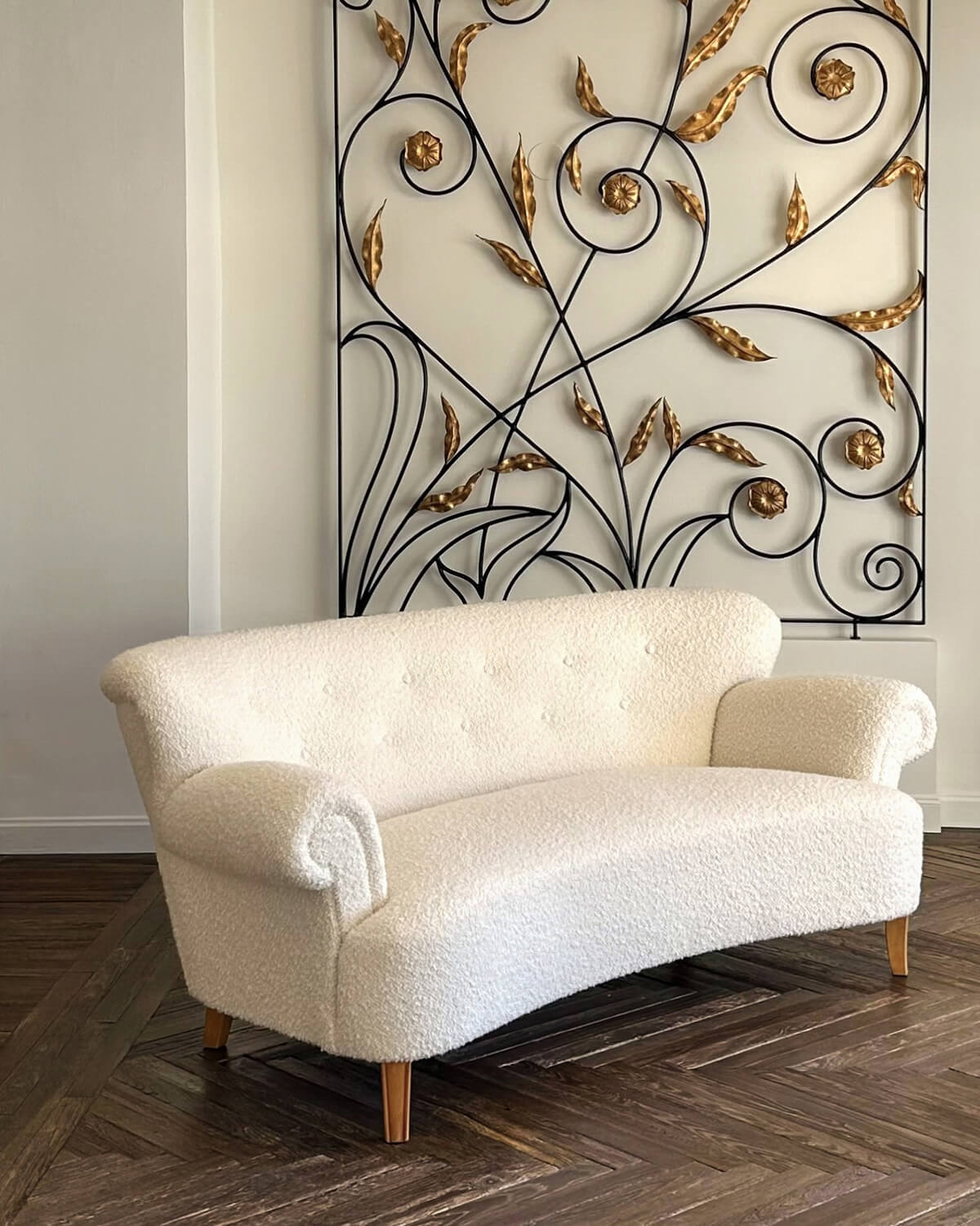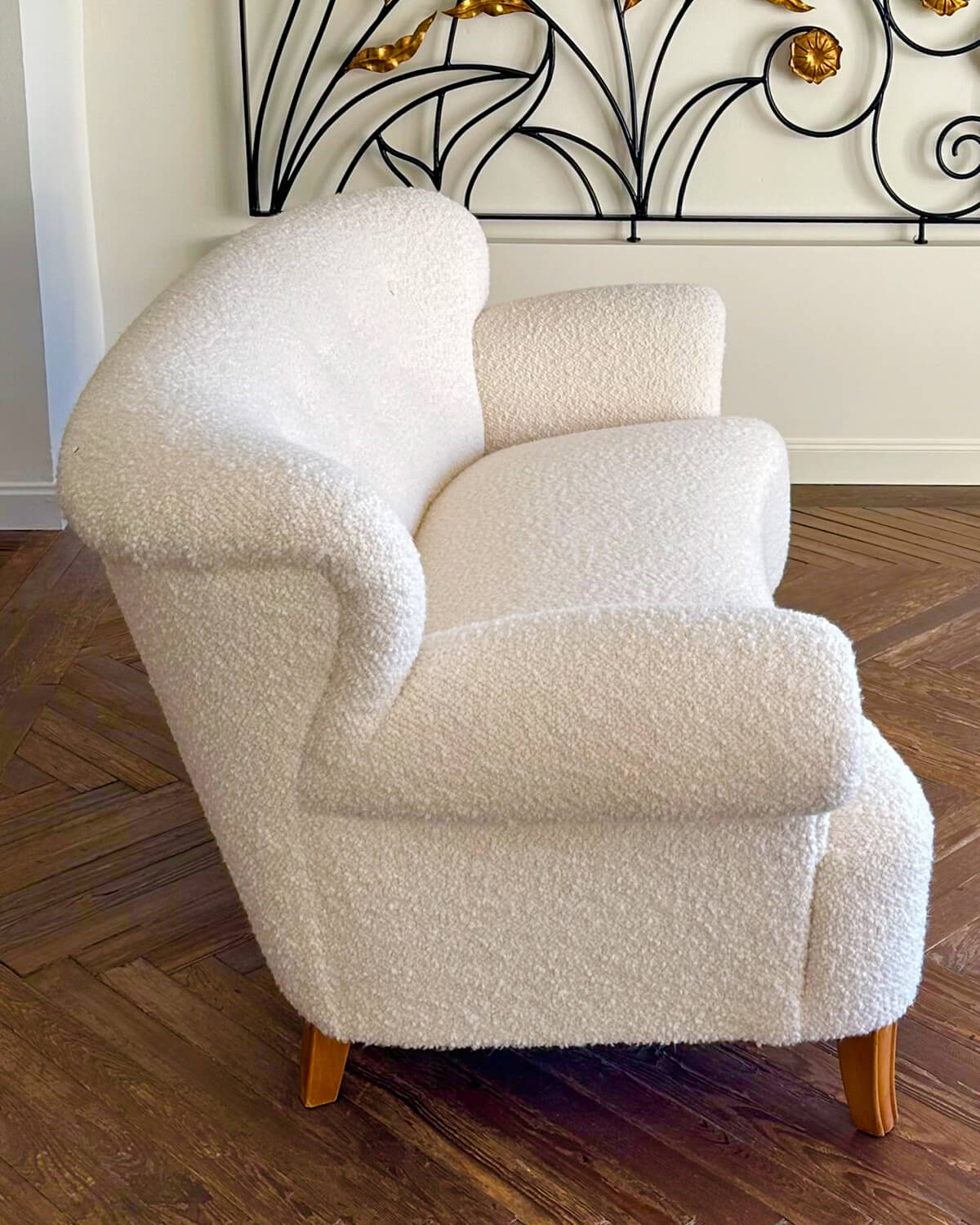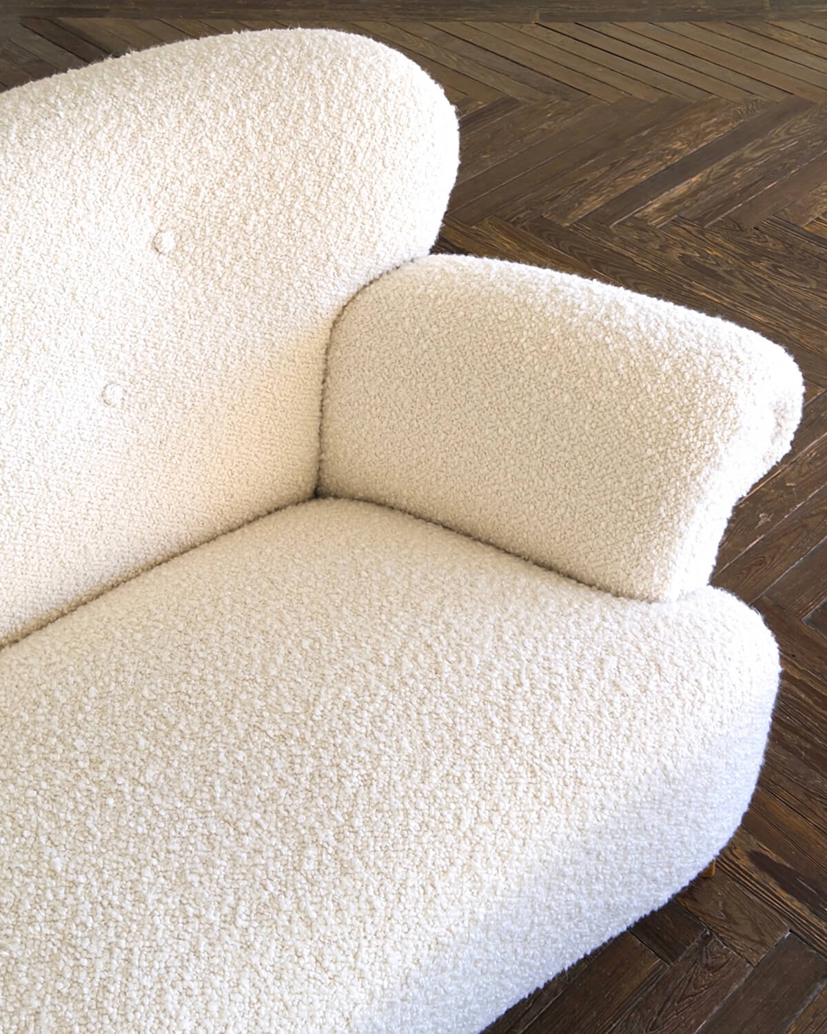 Sofá sueco diseñado por Axel Larsson para Bodafors, década de 1940. Retapizado en bouclé blanco por nuestro taller. Longitud: 190 cm, altura: 82 cm, profundidad: 85 cm.